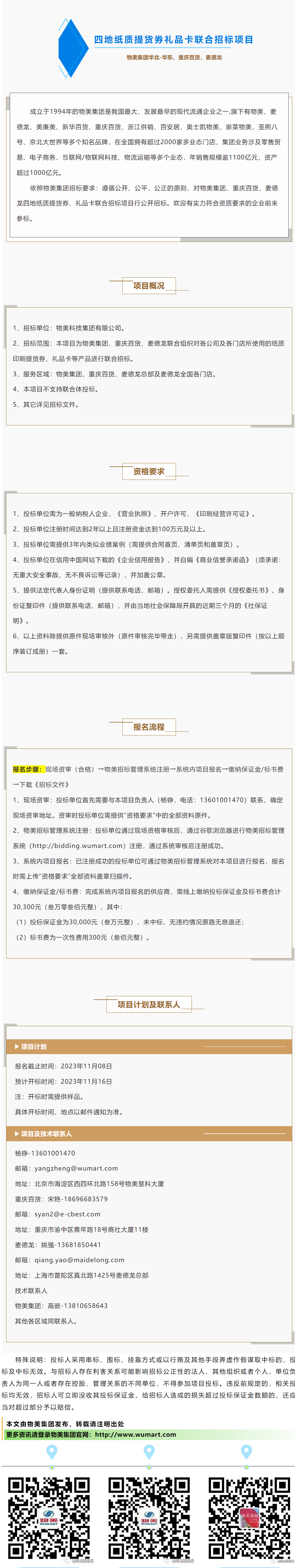 物美集团、重庆百货、麦德龙四地纸质提货券、礼品卡联合招标公告